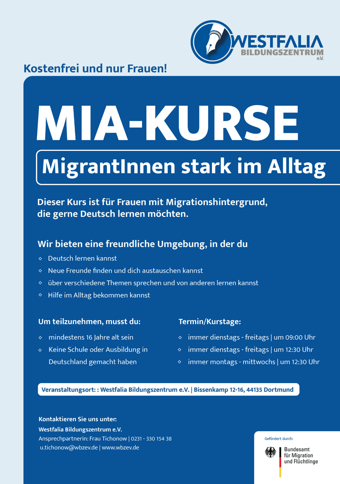 Sie sind eine zugewanderte Frau, die in Deutschland lebt und die deutsche Staatsangehörigkeit nicht besitzt, aber eine dauerhafte Aufenthaltserlaubnis hat. Sie sind Asylbewerberin und stammen aus Afghanistan, Eritrea, Somalia oder Syrien. Sie sind Asylbewerberin, vor dem 1. August 2019 nach Deutschland gekommen, haben seit mindestens drei Monaten eine Aufenthaltsgestattung und stammen aus einem Land, das nicht als sicheres Herkunftsland eingestuft ist. Außerdem sind Sie berufstätig, arbeitssuchend oder haben ein nicht schulpflichtiges Kind. Wenn Sie unsicher sind, ob Sie diesen Kriterien entsprechen, empfehlen wir Ihnen, sich direkt an uns zu wenden. Wir helfen Ihnen und geben weitere Informationen und Unterstützung.